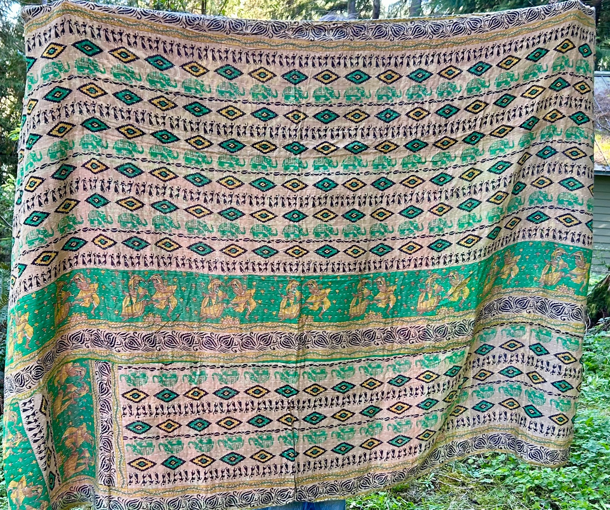 Zoom in!! Elephants, dancers, and more dancers, all rare in Kantha Land. Our Kantha Quilts are made out of vintage saris and are hand stitched by local artisans in India. All are reversible and are one of a kind. The pictures shown are of each side of the blankets. These are considered twin size and are approximately 85”x55”.