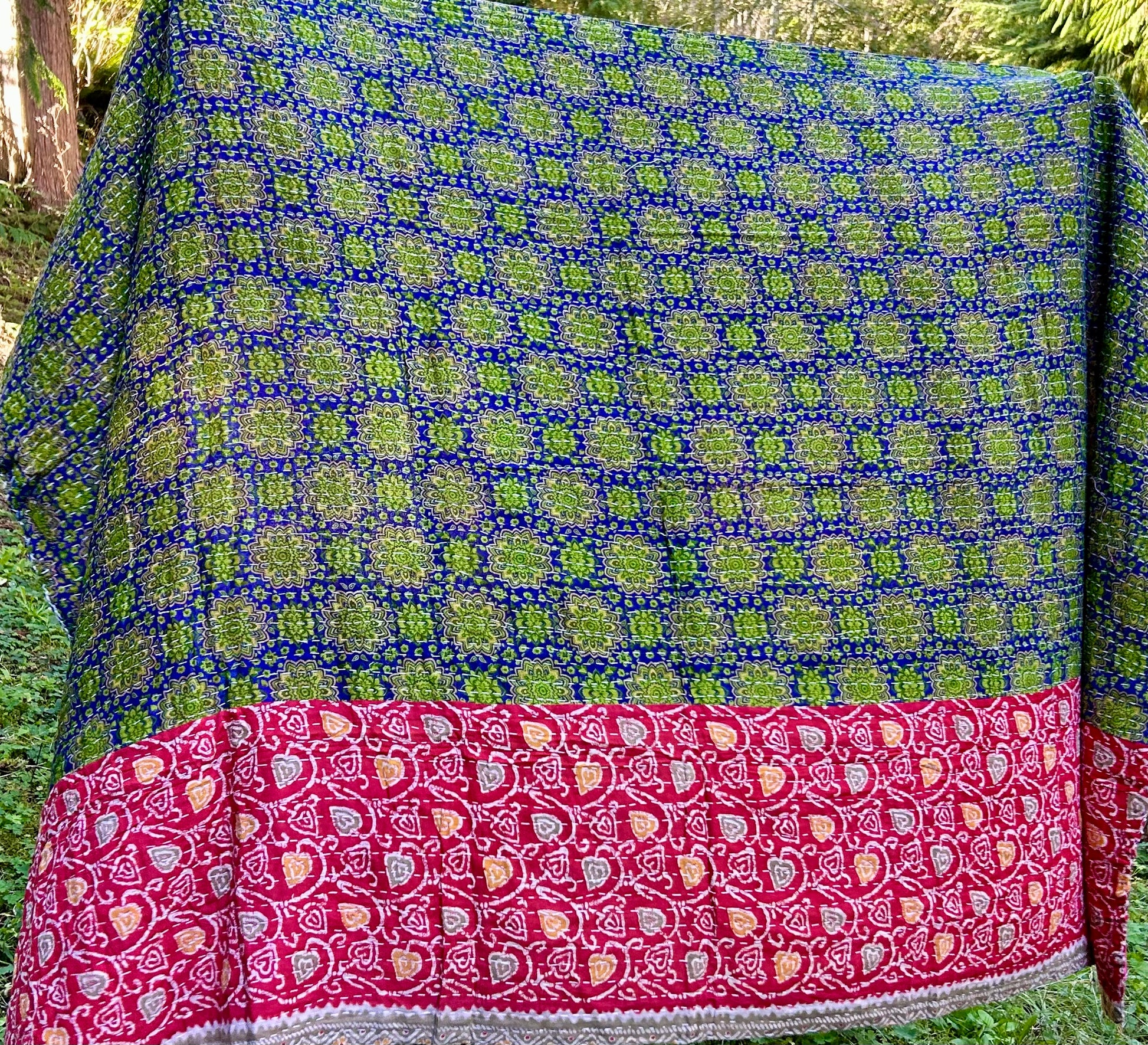 Our Kantha Quilts are made out of vintage saris and are hand stitched by local artisans in India. All are reversible and are one of a kind. The pictures shown are of each side of the blankets. These are considered twin size and are approximately 85”x55”.