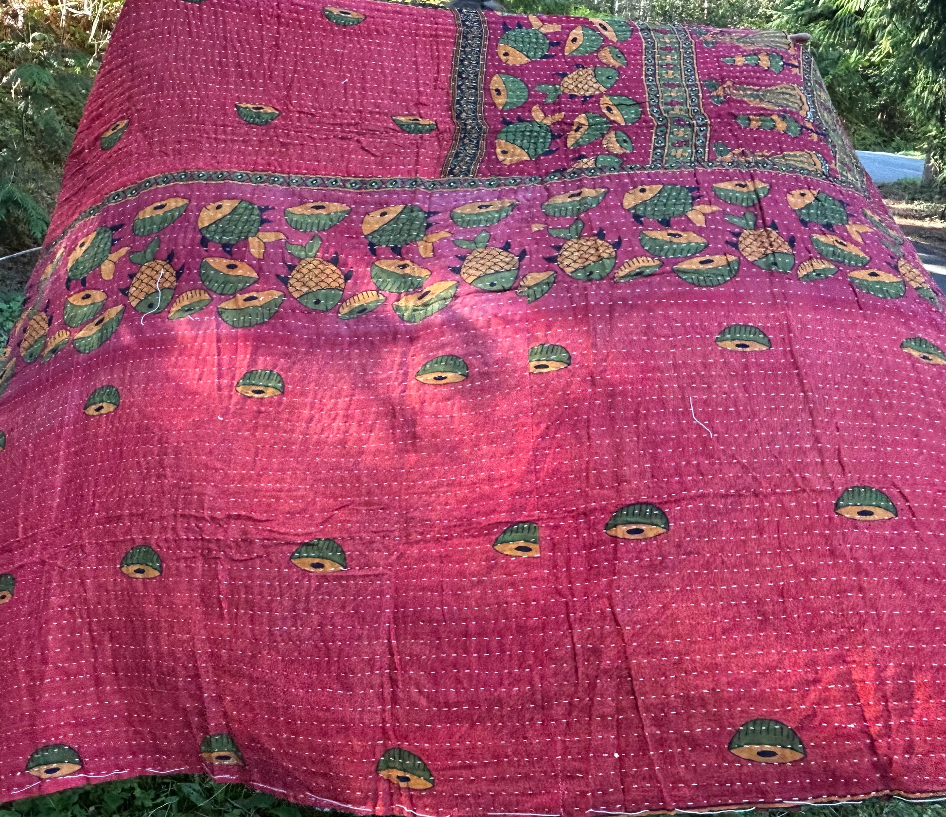 Kantha quilts are intentionally thin, without batting (perfect for warm climates). Please note the quilts may have loose stitching, small marks or spots, fading in areas and sometimes they may have "love patches " where the fabric is thin.. kantha lovers know that these “flaws” just adds to the charm.