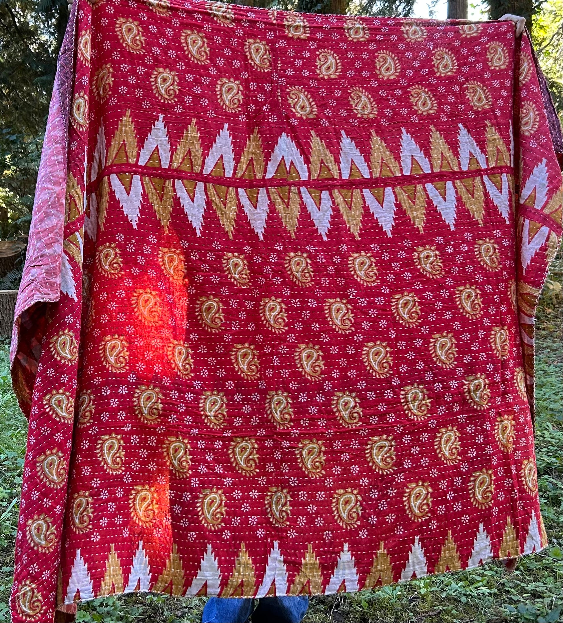 Our Kantha Quilts are made out of vintage saris and are hand stitched by local artisans in India. All are reversible and are one of a kind. The pictures shown are of each side of the blankets. These are considered twin size and are approximately 85”x55”.